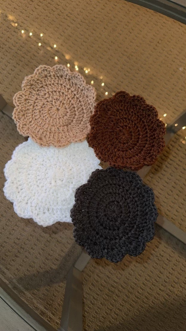 Set of four crocheted drink coasters: cute, cozy, and crafted with care. They're like tiny hugs for your tabletops, adding charm and protection with every sip.