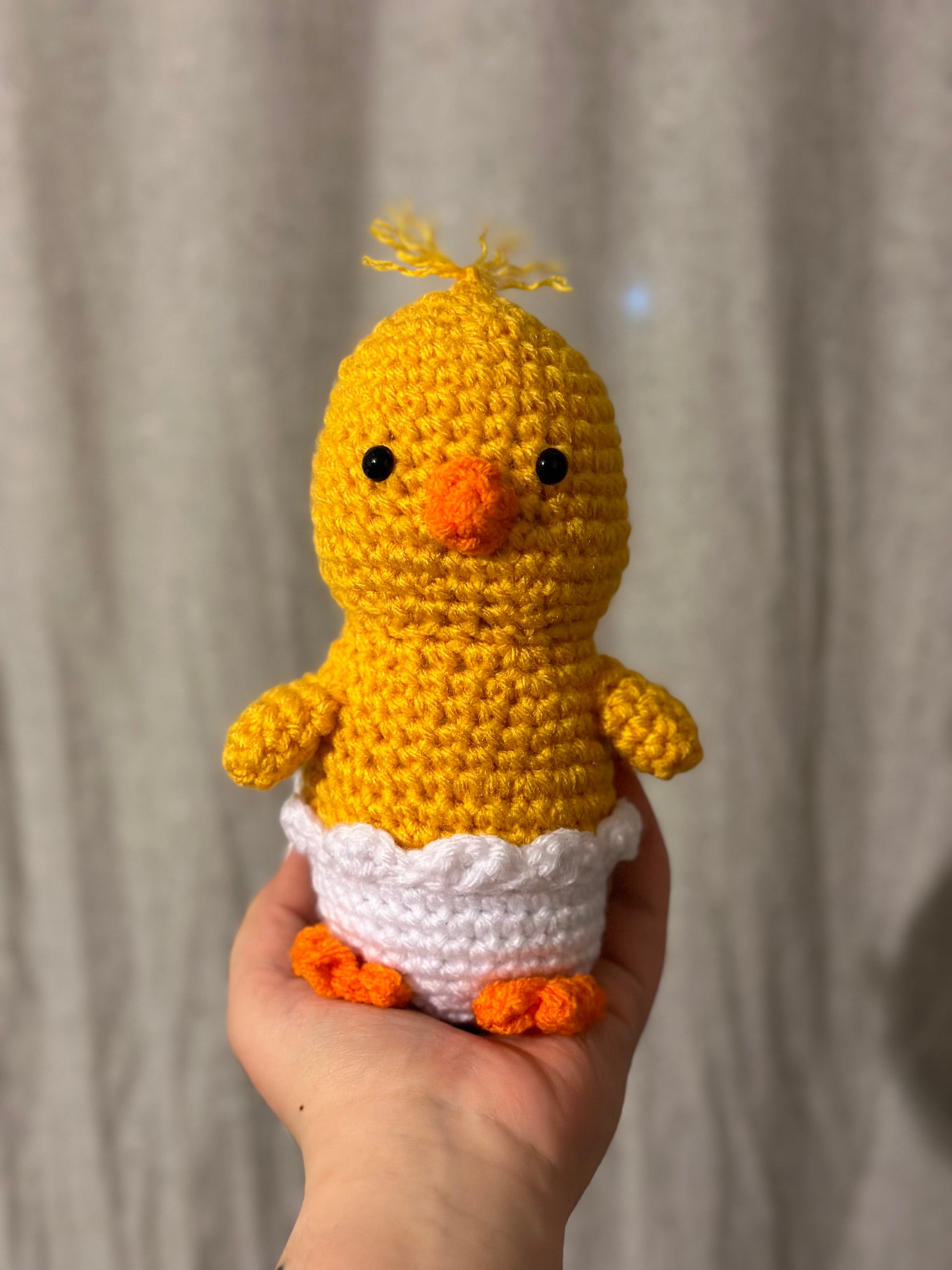 A creation bursting with joy. Fresh from its crocheted egg, this vibrant chick radiates warmth and cheer