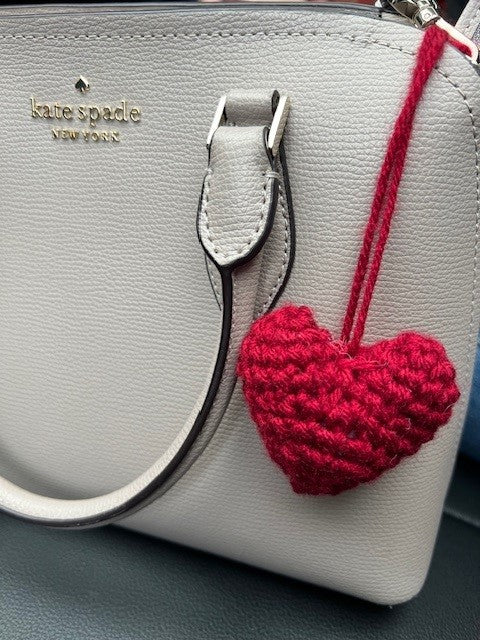 Crocheted heart bag charm: perfect for adding a touch of whimsy to your accessories, it's handcrafted with care to brighten up your bag, keys, or zipper pull.