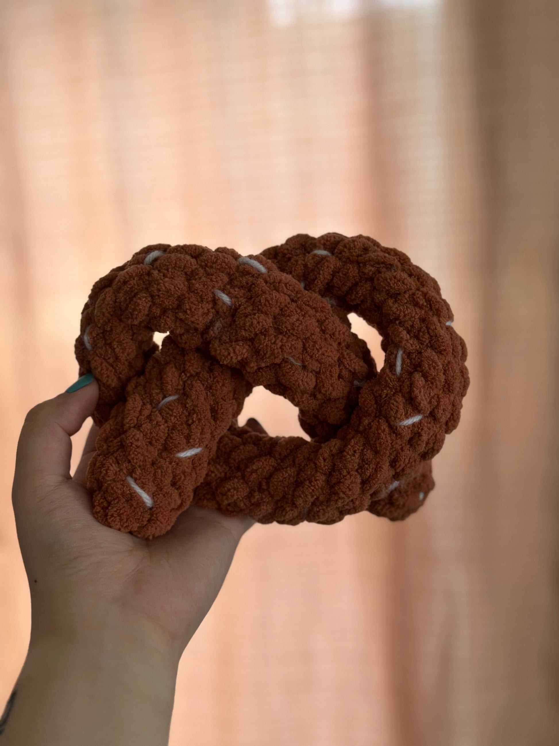 Introducing the Crocheted Pretzel! This charming creation boasts a warm, golden-brown hue and intricate stitch work, perfect for adding a touch of whimsy to any space. Display it proudly on your desk or bag for a unique conversation starter!
