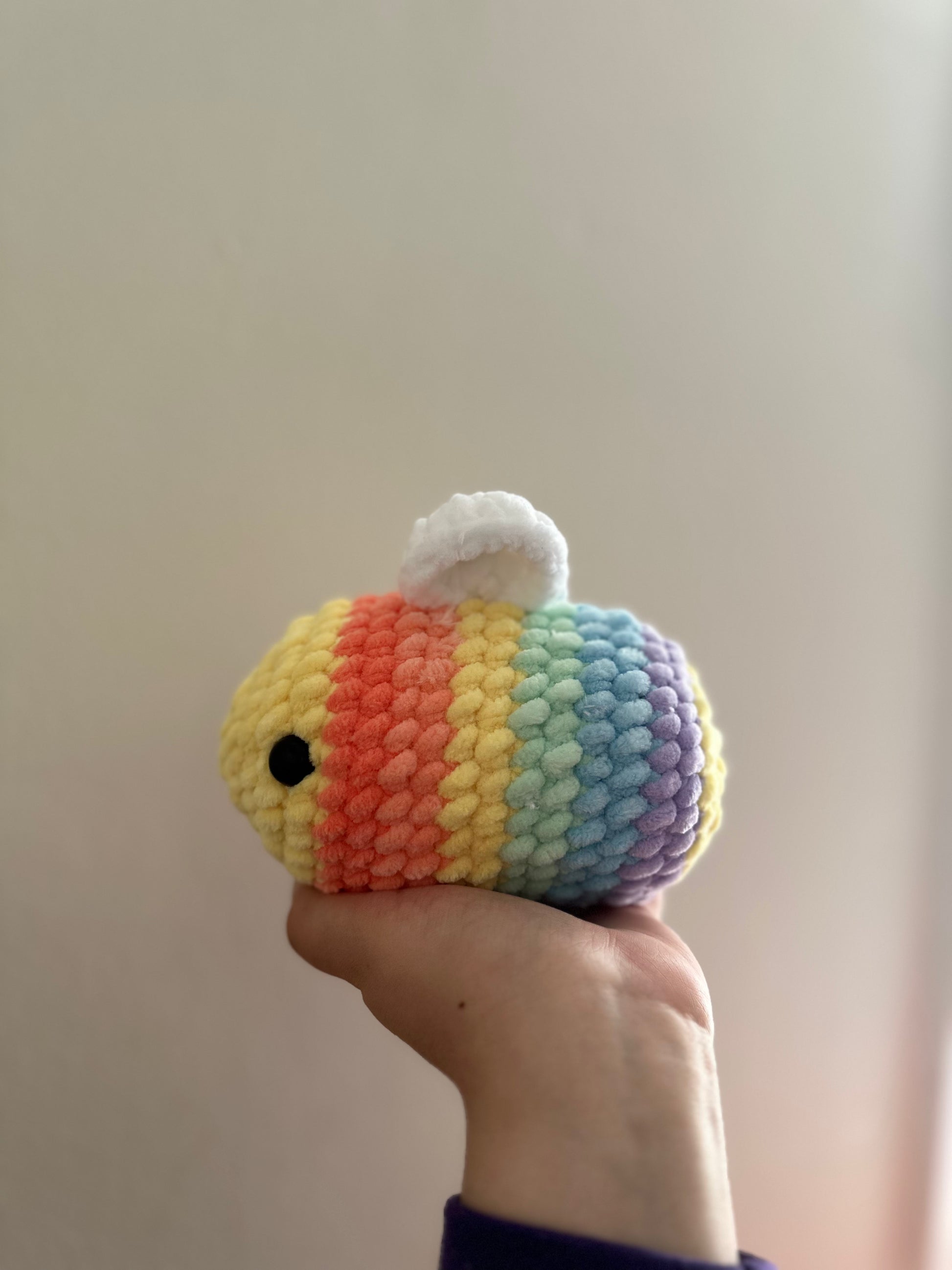 Introducing the Handmade Crochet Rainbow Bee – a vibrant and cheerful little companion. This adorable, colorful bee is perfect for adding a touch of whimsy to your decor or as a delightful gift for all ages.